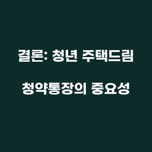 결론적으로, 청년 주택드림 청약통장은 청년들이 주택 구매를 위한 자금을 마련하는 데 큰 도움이 되는 중요한 금융 상품으로 자리잡고 있습니다. 청년들이 주거 문제를 해결하고, 경제적으로 안정된 삶을 영위할 수 있도록 돕는 역할을 할 것으로 기대됩니다.